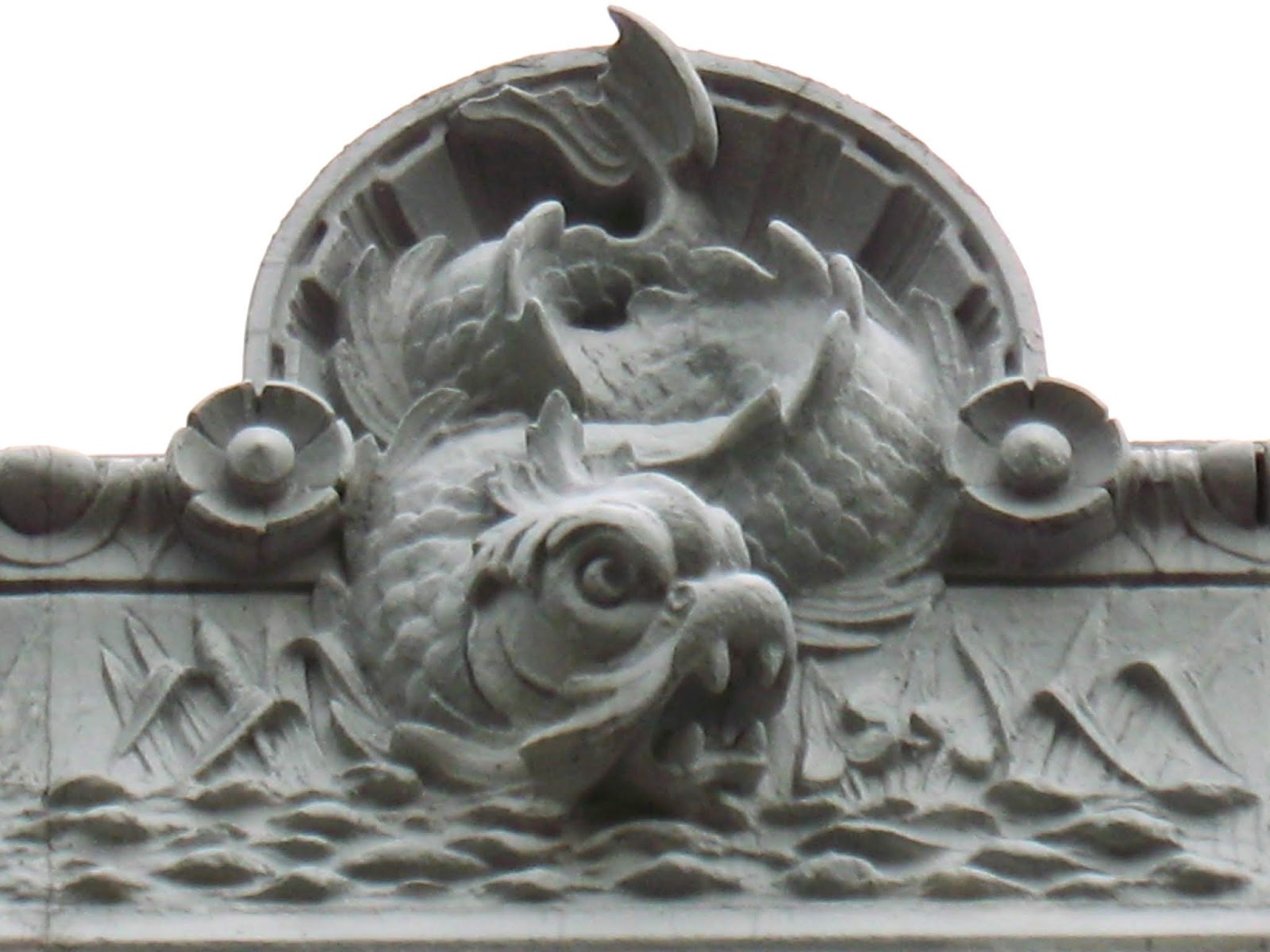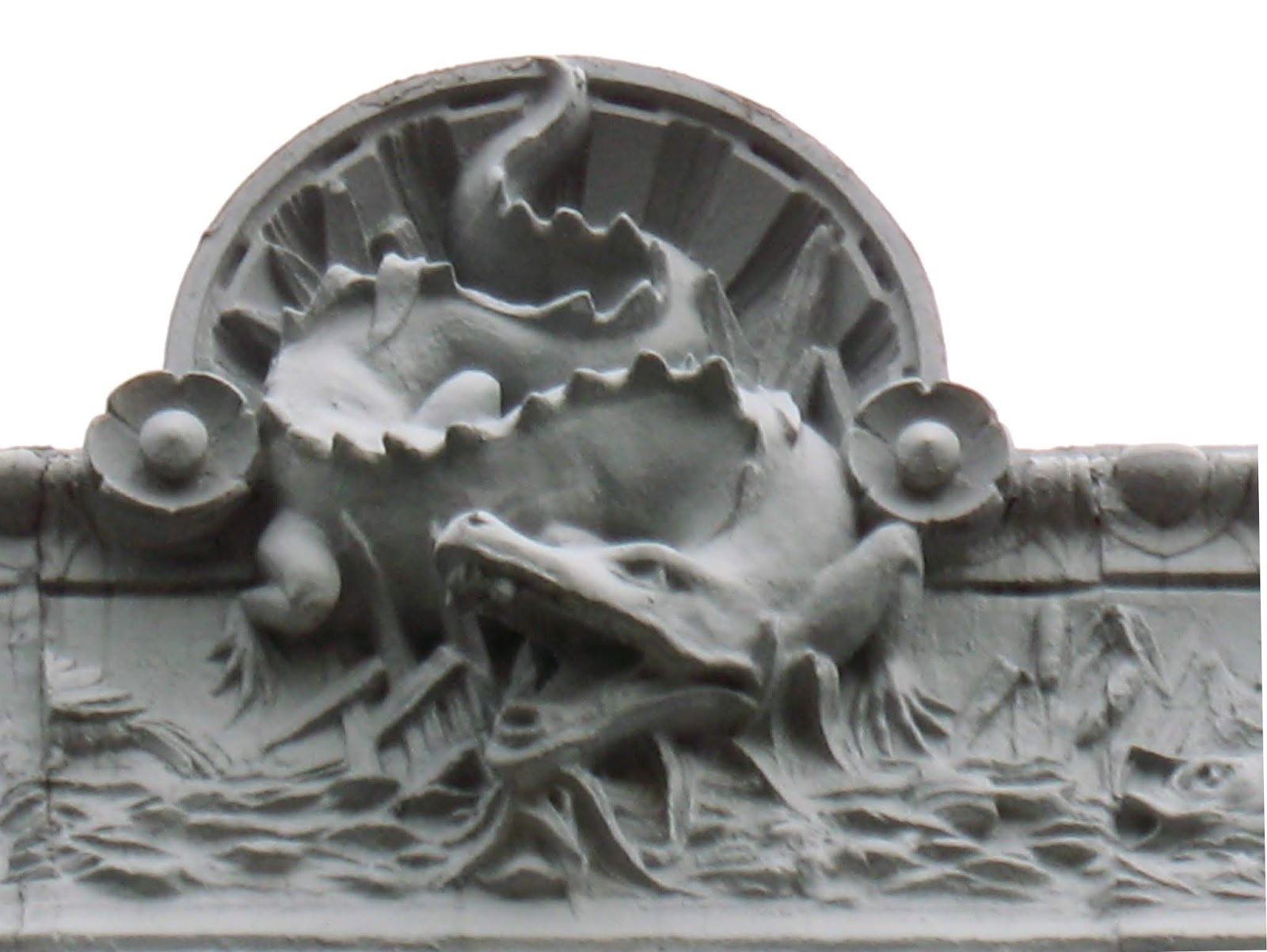 Những hình tượng bản địa trong những tuyệt tác phù điêu như cá chép hoá rồng; cá sấu trên đầm lầy thuở còn nguyên sơ của đất rừng phương Nam; Vạc bắt mồi. Cạnh hai bên những hình tượng bản địa này luôn có môtíp bông hoa nha phiến – loại cây mà Pháp độc quyền sản xuất và bán thuốc phiện.