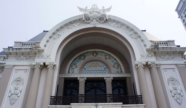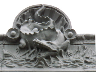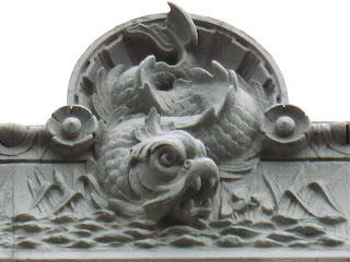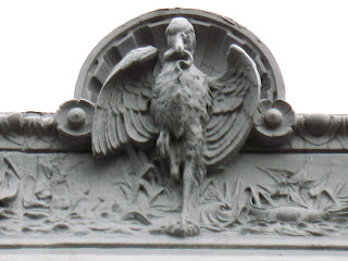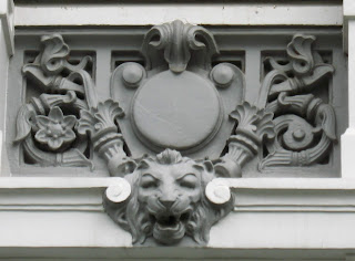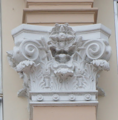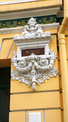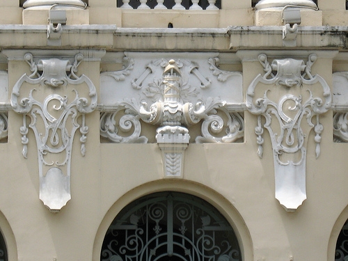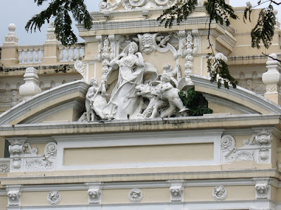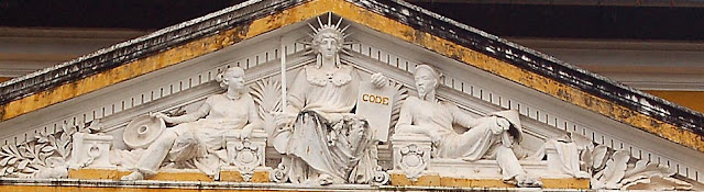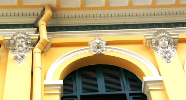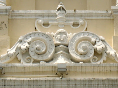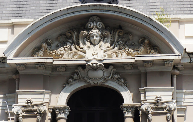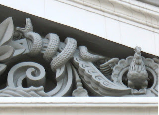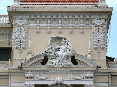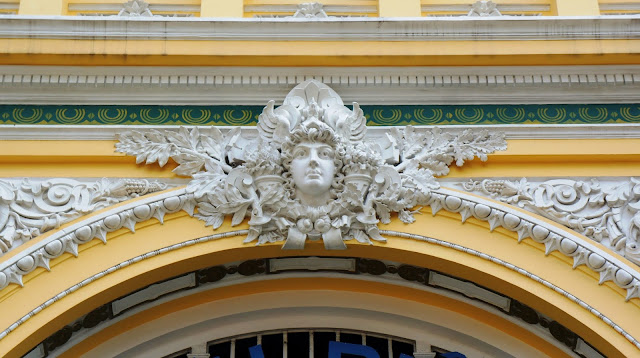 Mũ Tự do Phrygia, vành nguyệt quế, và nhà cách mạng, là mô típ lập lại suốt mặt tiền Toà Thị Chính