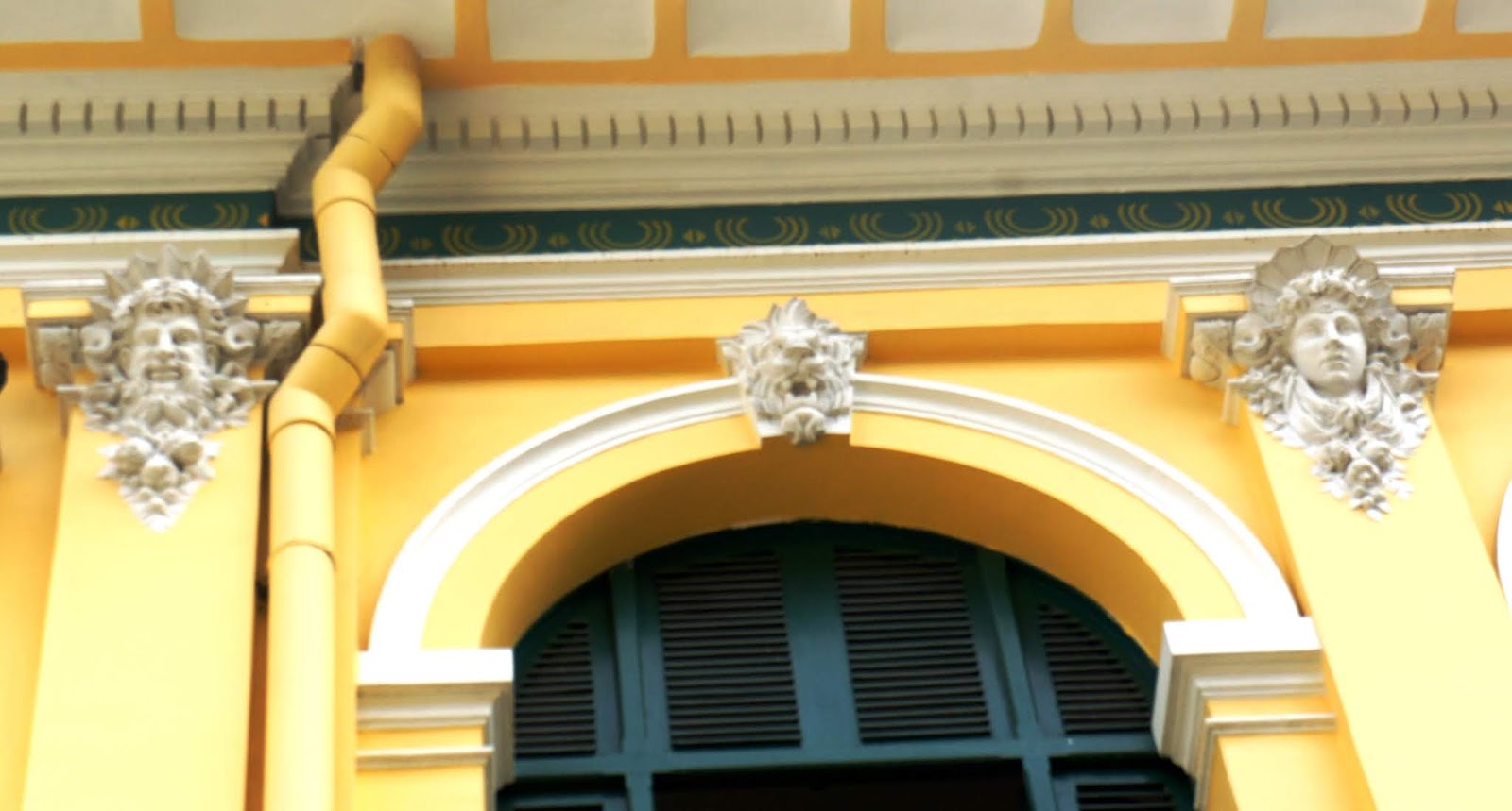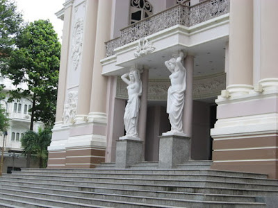 Trước hiên nhà hát có hai pho tượng người đàn bà ngực trần đứng với hai cánh tay nâng mái, thật ra là cột thức thứ tư của Hi-lạp gọi là Caryatid ít khi thấy, là loại cột có hình dạng người đàn bà.