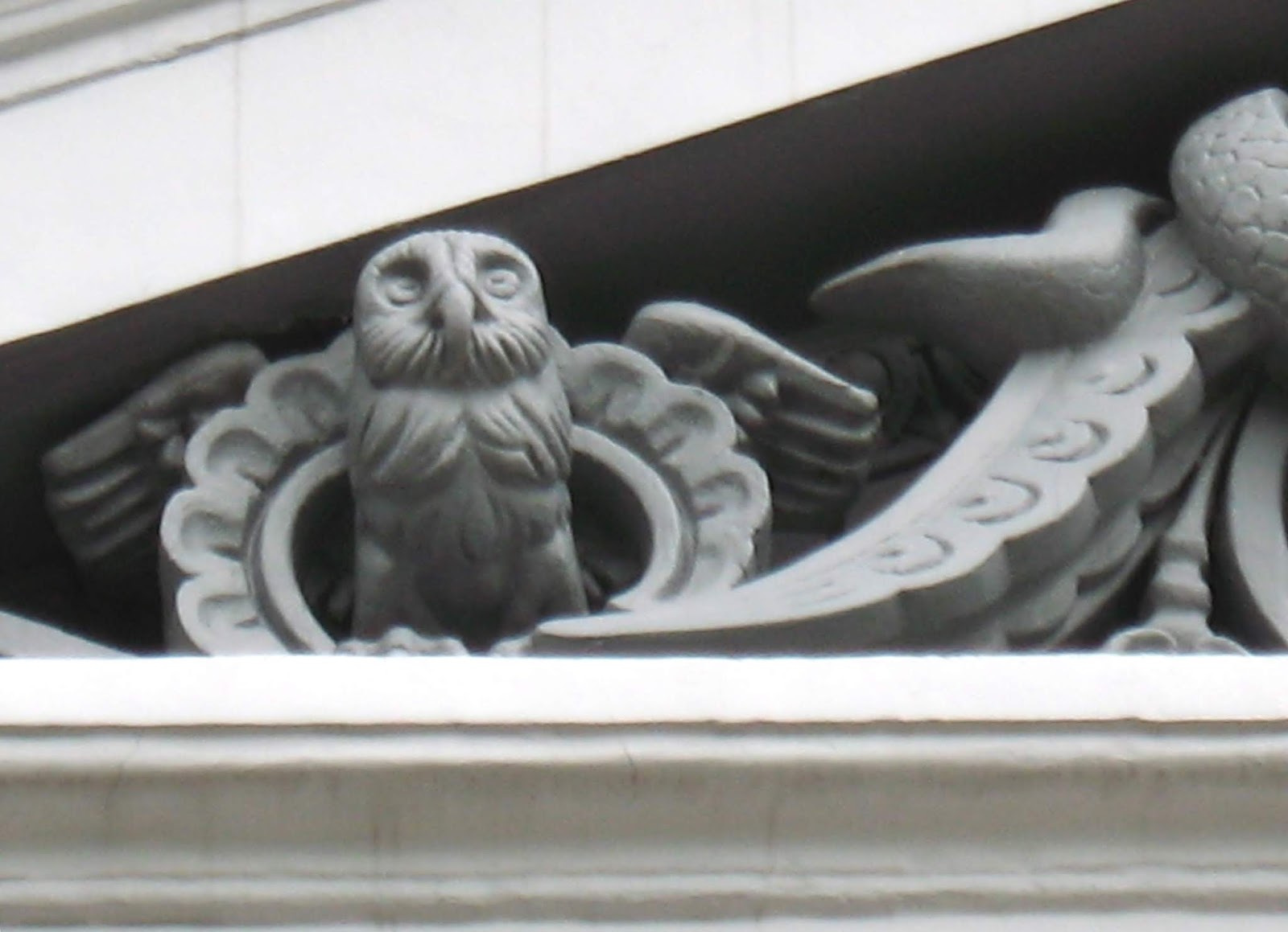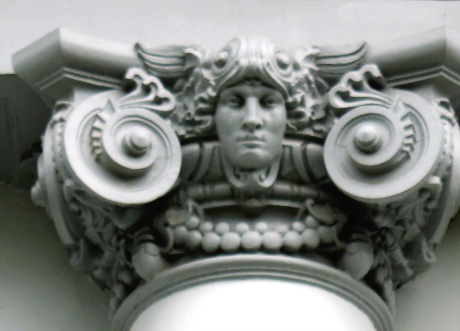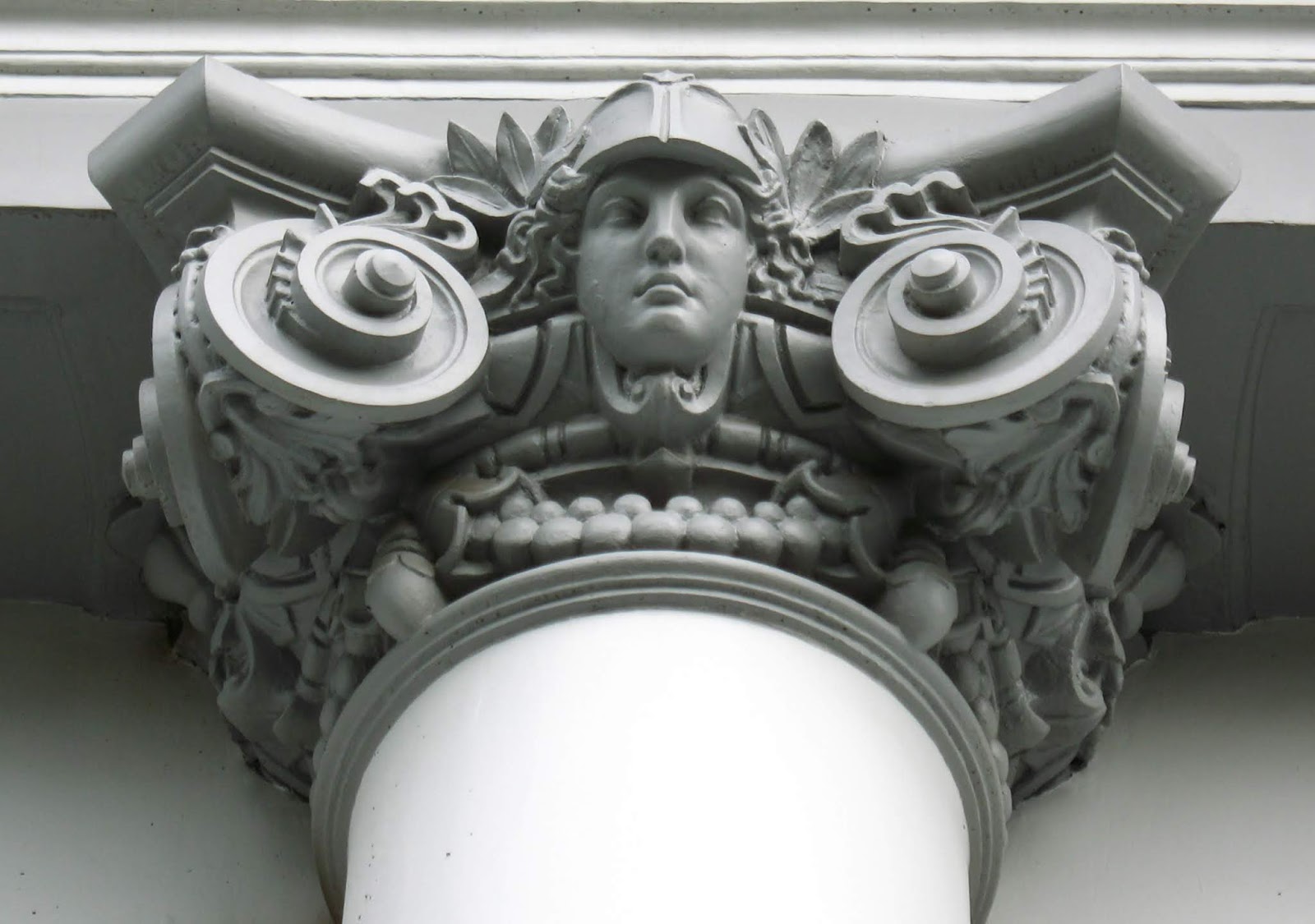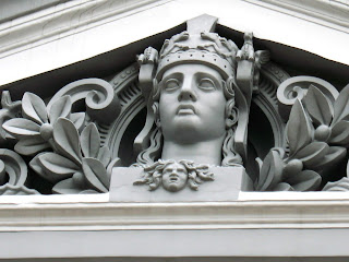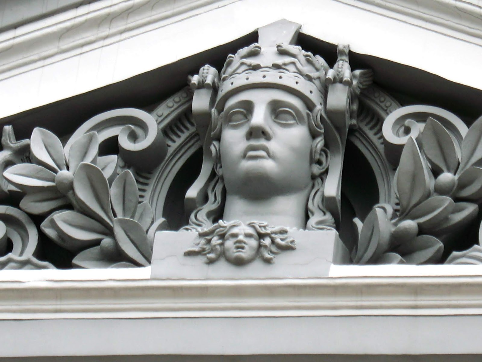 Trên đầu hồi (pediment) trung tâm toà nhà trang nghiêm với tượng đầu nữ thần Athena (Minerva) là nữ thần chiến binh, của trí tuệ, thi ca, y học, và âm nhạc.