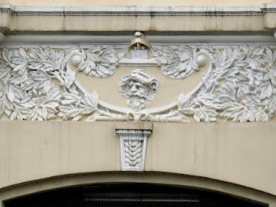 Cụm phù điêu chính trên vòm cửa Bưu điện Thành phố là đầu thần Mercury (Hermes) với mũ có đôi cánh – trong thần thoại Hi Lạp là vị thần đưa tin, biên giới và di chuyển, của đường sá, truyền thông, thần của du khách, và cũng là thần thương mại. Trang trí đầu thần Mercury, một bên là nhành nguyệt quế biểu tượng vinh quang và chiến thắng, bên kia là nhành sồi biểu tượng cho nghị lực, bền vững và cao quý.