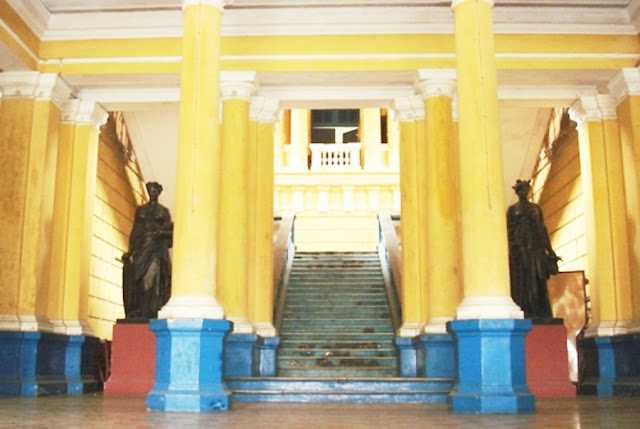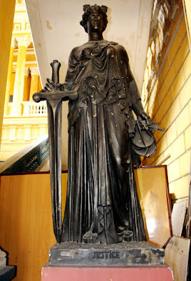 Đáng chú ý, ở gian sảnh pháp đình có hai pho tượng đồng cao khoảng 2m đặt trên bệ ở hai bên cánh cầu thang, bên phải là tượng nữ thần Công lí (Justitia), một tay chống thanh kiếm, tay kia cầm cái cân. Còn pho bên trái [vì người viết chưa có điều kiện được quan sát trực tiếp chỉ xem qua hình tìm được trên mạng, nên đoán] có lẽ là nữ thần Tự do Libertas, một tay cầm kiếm, tay kia cầm nhánh nguyệt quế.
