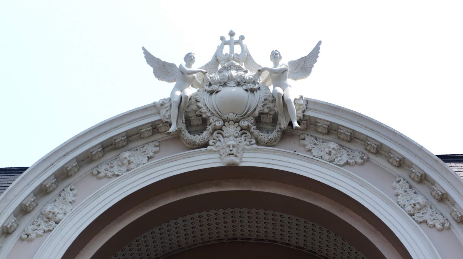 Vòng bán nguyệt quanh bức phù điêu của nữ thần Erato được trang trí bằng tranh tường vẽ khuôn mặt năm vị nữ thần nghệ thuật khác về sân khấu kịch nghệ, ca múa, sử thi… Biểu tượng chính trên đầu hồi nhỏ hình tam giác trước nhà hát (và hai bên hông nhà hát) là đầu tượng phù điêu một trong chín nữ thần nghệ thuật (Muses) là Erato, nữ thần của thơ ca trữ tình, cùng với những biểu tượng đi cùng là vòng hoa sim, tràng hoa hồng, và cây đàncithara (hay đàn lyre) mà ta thấy trong cụm điêu khắc trên vòm mái phía trước nhà hát với hai thiên thần giang cánh nâng nhạc cụ này lên.
