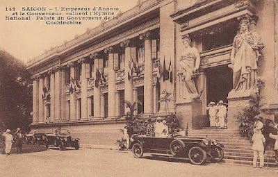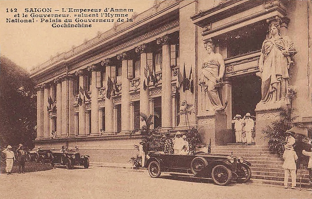 Trước Dinh Thống đốc Nam kì, qua hình ảnh trên bưu thiếp, ta thấy Vua Khải Định với Toàn quyền Albert Sarraut đứng trong xe hơi đang chào quốc ca. Trên hai bệ cao trước hiên là tượng hai nữ thần Địa Mẫu Demeter (Ceres) kích thước rất lớn, đây là nữ thần nông nghiệp, của sự thu hoạch dồi dào, của bảo hộ và ban phúc, tay ôm bó lúa mì, nuôi dưỡng con người bằng sự phì nhiêu của đất; còn pho tượng Địa Mẫu bên trái với biểu tượng một tay cầm cái cày, một tay thu hoạch, dạy con người biết cày cấy hoa màu.