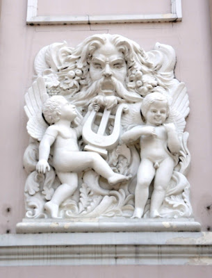 Ở hai bên mặt tiền nhà hát, dưới cụm trang trí cây đàn cithara là cụm phù điêu khuôn mặt của thần Dionysos với hoạ tiết dây nho – là vị thần của rượu nho, của lễ hội cuồng hoan, thần của kịch nghệ, có hai thiên thần bé con nhảy múa với cây đàn cithara. Motip khuôn mặt thần Dionysos ta sẽ thấy lập lại suốt dải trang trí bên dưới mái nhà hát.