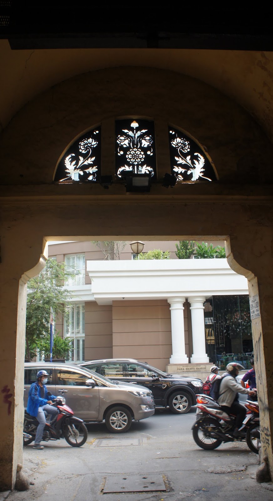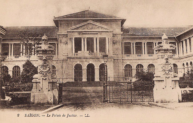 Pháp đình Sài Gòn vào đầu thế kỉ 20. Trên hai trụ cổng uy nghi với tượng đầu người lính La Mã canh gác. Bên dưới là phù điêu quốc huy Cộng hoà Pháp RF (République française), và thêm hai biểu tượng là thanh kiếm và cán cân pháp luật.