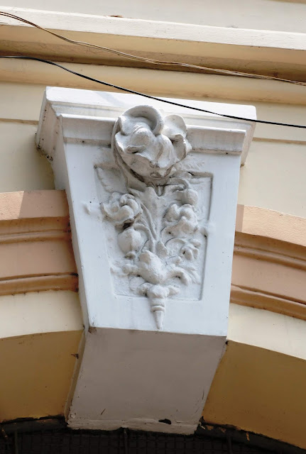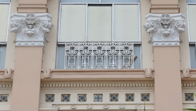 Phù điêu motif hoa và quả nha phiến trên đầu cột ở tầng ba. Cũng vậy, trên các vòm cửa ở xung quanh tầng trệt, cũng như hoa nha phiến được cách điệu ở dải trang trí dưới cột phù điêu ở tầng ba trong những vuông gốm màu, và được gắn trang trí ở diềm song song bên dưới nữa.