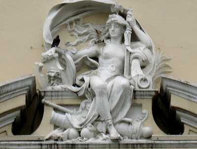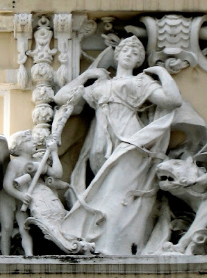 Nhìn cận những chi tiết cho thấy nữ thần Athena đội nón sắt cùng những biểu tượng gắn liền như ngựa chiến, hai bên là chim cú và thêm một biểu tượng Pháp là con ‘gà trống Gaulois’, hai con rắn bảo vệ, và nhánh cây olive do nữ thần sáng tạo ra làm tặng vật cho thành Athens để sản sinh ra dầu olive đem lại thịnh vượng lâu bền. Bên dưới Athena là đầu tượng thần biển hoang dã Poseidon (Neptune) – Poseidon là vị thần từng tranh đua với Athena nhưng bị thất bại và khuất phục. Ở đây tượng nữ thần Athena là biểu tượng hàm nghĩa sự toàn thắng của văn minh đô thị và sự thuần hoá lẫn khai hoá.