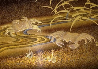 Đồ sơn mài trang trí dát vàng không phải là thứ để ngắm dưới ánh sáng rực rỡ và nhìn thoáng một cái mà thấy hết được; nó nên được đặt trong bóng tối để một phần chỗ này chỗ nọ bắt lấy thứ ánh sáng lờ mờ. Những hoa văn cầu kì của nó lùi vào bóng tối, gợi lên thay vào đó là một vầng hào quang khó tả của sự sâu thẳm và bí ẩn, của những gợi ý và ám thị một phần nào. Nước bóng của sơn mài toát ra trong màn đêm phản chiếu từ ngọn nến chập chờn cho biết hơi gió thi thoảng tìm cách lọt vào gian phòng tĩnh mịch, cám dỗ ta vào trạng thái huyền ảo. Nếu lớp sơn mài bị tước đi thì sức mê hoặc của nó cũng biến mất khỏi cái thế giới huyễn mộng được tạo bằng thứ ánh sáng kì lạ từ ngọn nến hay ngọn đèn, của thứ ánh sáng dao động theo nhịp đập của màn đêm. Thật vậy, thứ ánh sáng mong manh ấy, khó nắm bắt, dập dờn như thể những dòng suối nhỏ đang chảy trong gian phòng, thu thập những vũng nước nhỏ đây đó thành một hoa văn sơn mài trên bề mặt của màn đêm.