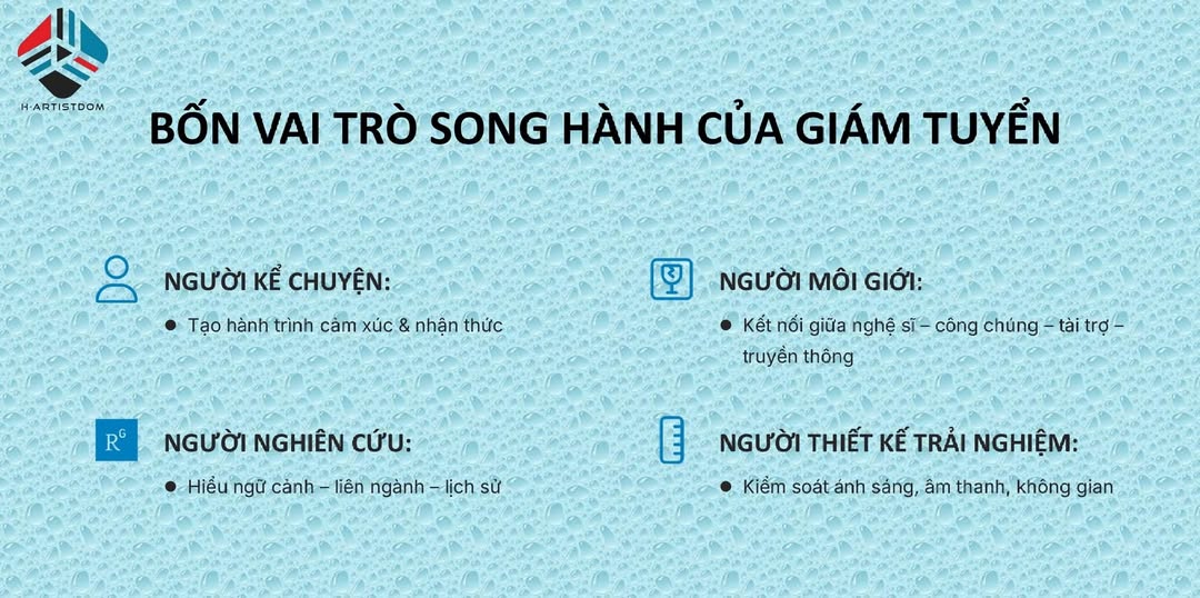 Bốn vai trò của giám tuyển trong sơ đồ bên dưới bao kể chuyện, nghiên cứu, môi giới và thiết kế trải nghiệm không phải bốn nhiệm vụ rời rạc mà đó là bốn mặt của cùng một thực hành mang tính kiến tạo, nơi giám tuyển làm việc đồng thời với ngữ cảnh, ngôn ngữ, ý nghĩa và trải nghiệm.