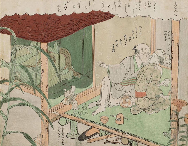 Giống với thi pháp thanh mà tục, tục mà thanh của Hồ Xuân Hương, văn hoá Nhật cũng có cách nhìn đặc biệt vào sự vật, trong đó cái thanh/nhã và cái tục chồng chéo lên nhau. Đặc biệt có thể thấy trong mitate-e shunga của Harunobu, những miêu tả tập quán tính dục hàng ngày có thể xem như là cái tục được phủ lên bằng cái thanh của nghệ thuật.