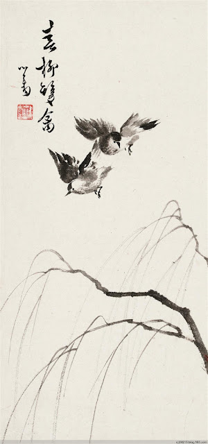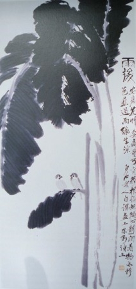 Trong bức Sau cơn mưa (hình 7) miêu tả cơn mưa chợt đến chợt tạnh, vài con se sẻ nhỏ đậu trên một bẹ chuối. Tàn chuối che hầu như xanh rợp bầu trời được vẽ bằng lượng nước và mực dồi dào, đậm đặc. Tuy vẽ bằng thuỷ mặc đơn sắc nhưng lại thể hiện một thế giới cảm giác đầy màu sắc. Trên tranh đề thơ: “An bình hoa thảo yếu thương lượng, Khả khẳng di căn bạng đoản tường; Tâm tịnh nhàn trước vật diệc tịnh, Ba tiêu quá vũ lục sinh lương.”(Chọn chỗ an bình, hoa cỏ cần trao đổi, nếu chúng muốn dời gốc xuống nương chốn tường thấp; mọi vật cũng tĩnh khi nhìn bằng tâm an tĩnh, cây chuối sau cơn mưa xanh mướt và mát dịu).