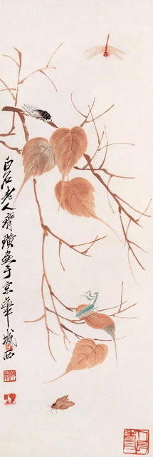 Trong bức Lá bồ đề và côn trùng (hình 8), Tề Bạch Thạch kết hợp cả hai bút pháp công bút và tả ý; dùng công bút để vẽ trùng, và bút pháp tả ý để vẽ lá. Mùa thu, lá bồ đề biến từ màu lục thành nâu đỏ, sang hồng nhạt rồi bắt đầu rụng. Lá bồ đề mất hết chất nước, lộ ra gân mạch mịn dầy kín và tinh xảo như lụa dệt. Ở đây trên mặt đất ngập nắng, một con bươm bướm và con chuồn chuồn bay qua, trong khi đó một con ve phơi nắng trên nhánh cây và con châu chấu đậu dưới đất. Trong cùng một không gian và một khoảnh khắc, hoạ gia đã nắm bắt được tính thanh thản và nồng nhiệt của mùa thu. Tuy những chiếc lá bồ đề và côn trùng được vẽ rất chi tiết, nhưng nhánh cây lại được vẽ với bút pháp tả ý bằng mực nhạt. Tác phẩm có tính khai phá này điển hình cho sự tổng hợp hài hoà cả hai hoạ pháp của Tề Bạch Thạch.