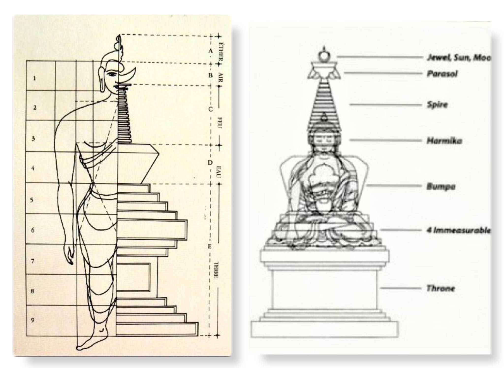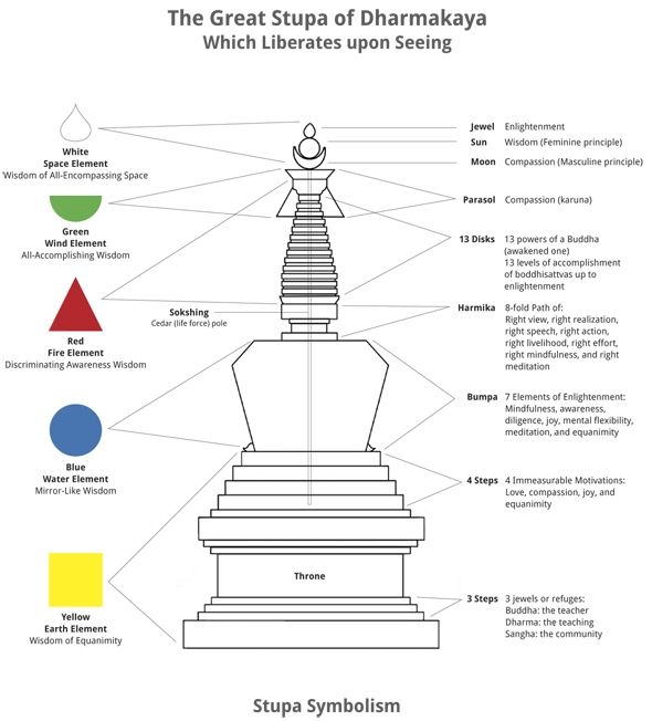 Mô hình một stupa, biểu trưng cho thể tướng Tam Thân Phật: Pháp Thân, Báo Thân và Hoá Thân. Năm thành phần tương ứng với năm nguyên tố hoặc đủ năm phần của Pháp Thân: Giới, Định Huệ, Giải thoát, Giải thoát tri kiến: