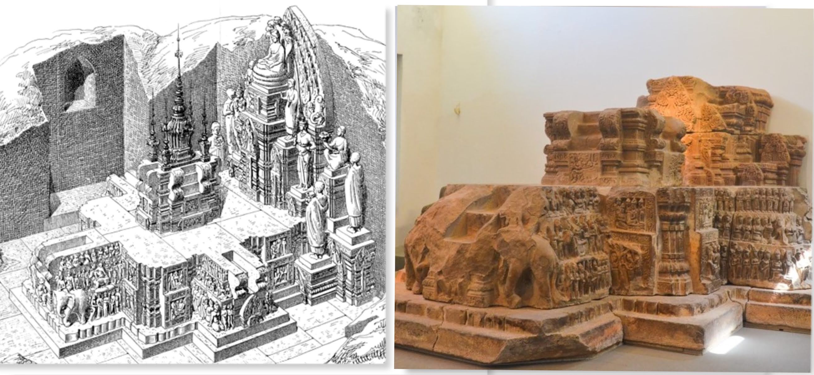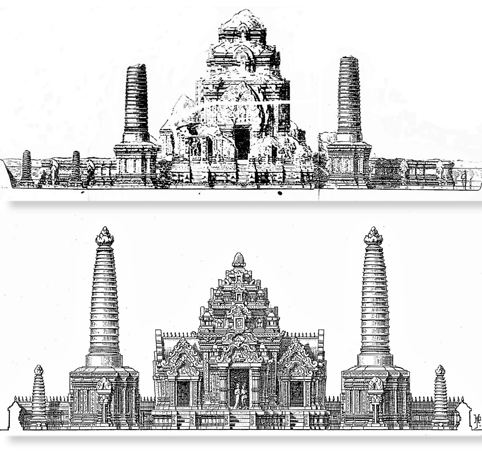 Hai bản vẽ hiện trạng khảo cổ và bản vẽ tái cấu trúc Phật viện Đồng Dương (mặt trước của cụm tháp phía tây) của Parmentier. Ta thấy có hai stupa lớn ở hai bên tháp thờ trung tâm của Phật viện và những stupa nhỏ xung quanh.