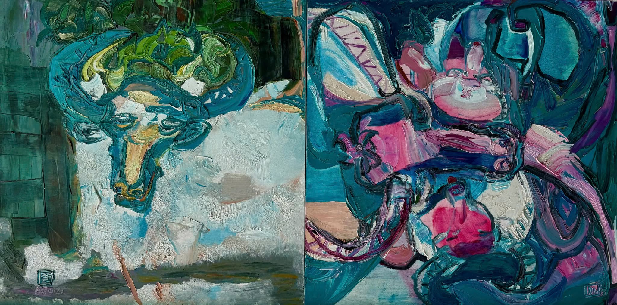 Điều gây ấn tượng mạnh trong quá trình sáng tác của Kim Chi chính là cách chị đối thoại trực tiếp với màu sắc. Màu được đặt thẳng lên mặt toan, không pha, không trung gian palette. Chị tém bay (dao vẽ), miết cọ, đắp nổi… để màu hiện ra như một dòng cảm xúc chảy trực tiếp từ tay người vẽ. Lớp màu thường dày, có bức gần như một dạng phù điêu mềm với những địa tầng màu sắc chồng lên nhau. Vậy mà tranh vẫn nhẹ, thậm chí như “thở” được – có lẽ nhờ cách chị không để kỹ thuật trói buộc mình.