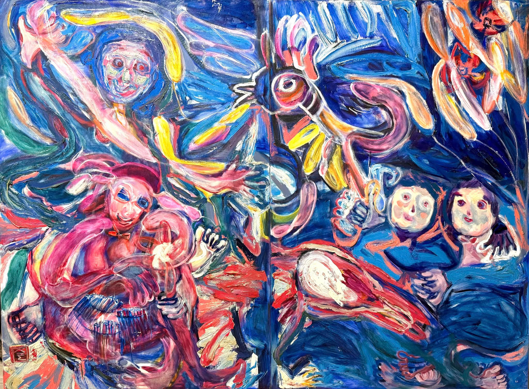 Triển lãm “No Stopping 2” với hơn 100 tác phẩm sơn dầu đánh dấu một cột mốc quan trọng trong hành trình nghệ thuật của chị. Mỗi bức là một lát cắt ký ức, một câu chuyện kể bằng màu sắc: hình ảnh người bà, chiếc chong chóng quay giữa gió, những hình tượng ẩn dụ cho những chuyển động đời sống – khi nhẹ nhõm, khi day dứt – nhưng luôn trở về với sự an nhiên dung dị.