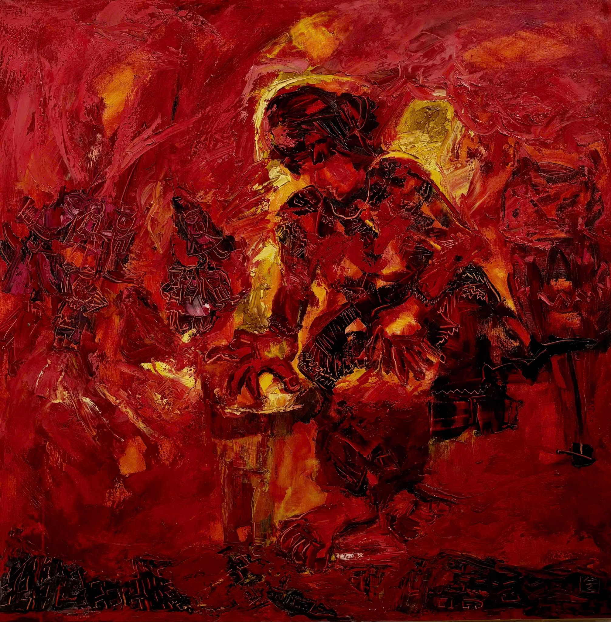 Điều gây ấn tượng mạnh trong quá trình sáng tác của Kim Chi chính là cách chị đối thoại trực tiếp với màu sắc. Màu được đặt thẳng lên mặt toan, không pha, không trung gian palette. Chị tém bay (dao vẽ), miết cọ, đắp nổi… để màu hiện ra như một dòng cảm xúc chảy trực tiếp từ tay người vẽ. Lớp màu thường dày, có bức gần như một dạng phù điêu mềm với những địa tầng màu sắc chồng lên nhau. Vậy mà tranh vẫn nhẹ, thậm chí như “thở” được – có lẽ nhờ cách chị không để kỹ thuật trói buộc mình.