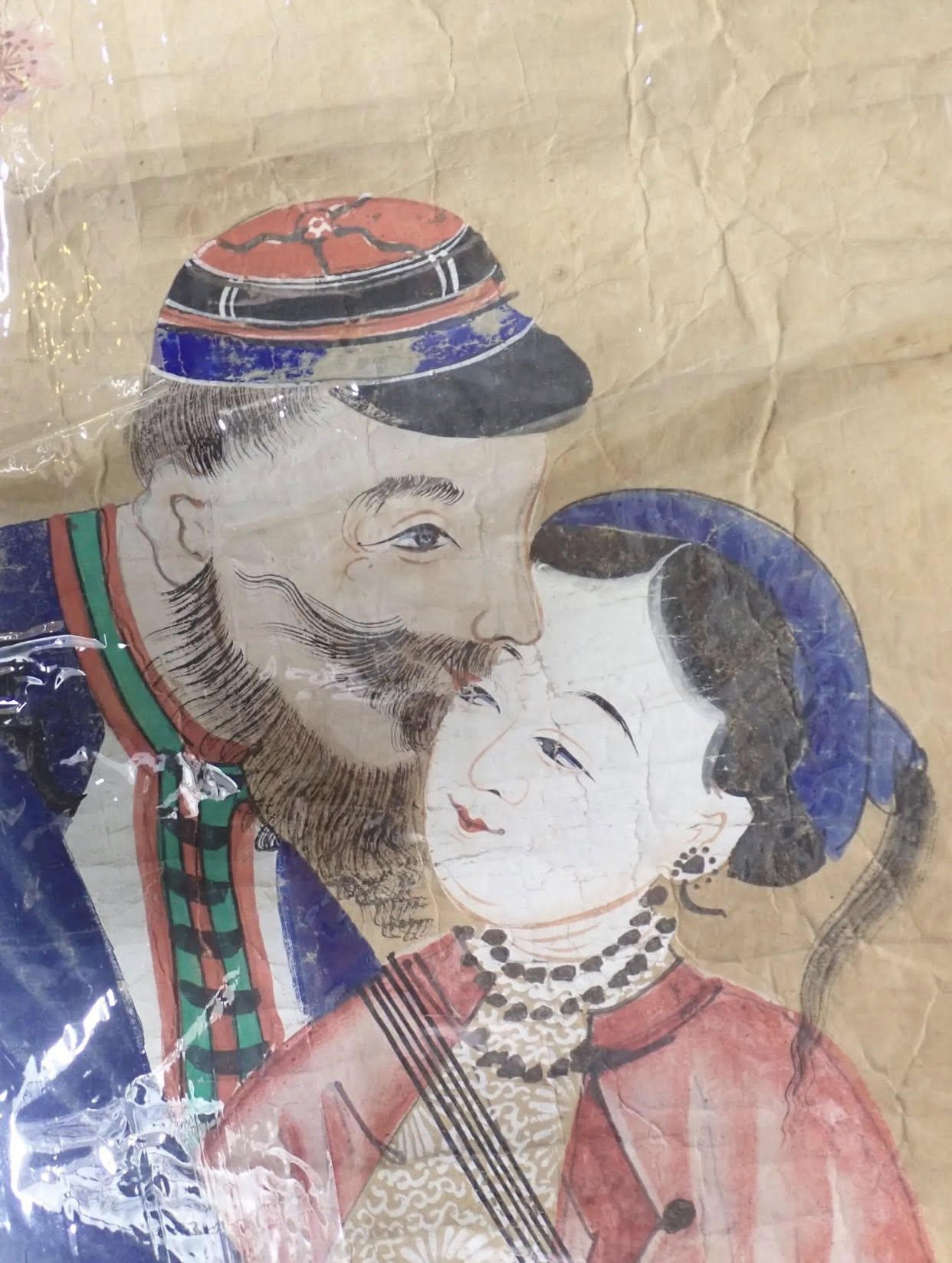 – Mô tả: một bức tranh Việt Nam, vẽ mực và màu, mô tả một cặp tình nhân đang âu yếm nhau. Đây là mối tình giữa người đàn ông châu Âu với người đàn bà bản xứ. Dựa vào trang phục người đàn bà, có thể thấy người này xuất thân từ khu vực Bắc Kỳ thuộc Liên bang Đông Dương, Đế quốc Thực dân Pháp. Dưới sự cai trị của Pháp tại khu vực Đông Dương, đã có nhiều cuộc hôn nhân Âu – Việt, mà người phụ nữ bản xứ bất chấp tất cả để kiếm cho bằng được một người chồng Tây. Điều này được thể hiện qua phóng sự “Kỹ Nghệ Lấy Tây” của nhà văn Vũ Trọng Phụng, một cây bút trứ danh trong dòng văn học hiện thực phê phán của Việt Nam vào đầu thế kỷ XX. Sau đây là vài đoạn trích từ tác phẩm “Kỹ Nghệ Lấy Tây”:
