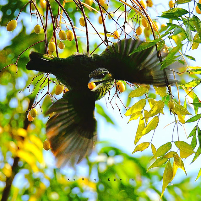 Sự quyến rũ của màu sắc. Màu vàng tươi rói của nắng trên lá và quả, cái màu vàng có thể ăn được ngon lành ấy chẳng phải nhờ máy Dương Minh Long và Lê Thanh Phong mua cho, chính là nhờ trực cảm về ánh sáng trời đã ban cho Vĩnh Quyền. Cùng với những sợi sáng trắng mê hoặc, những đốm đỏ thảng thốt, màn sương blue tươi non mơ màng, và chiếc lá green xanh đến nỗi như đâm ra từ trang sách, màu vàng tươi rói ấy đã hút hồn những người mê nhiếp ảnh.