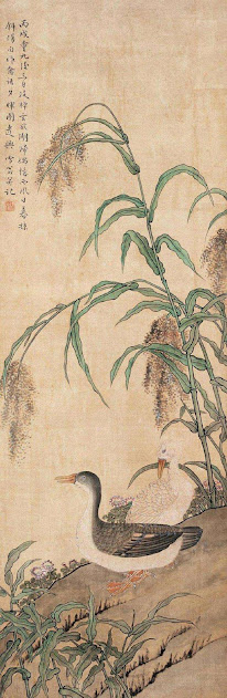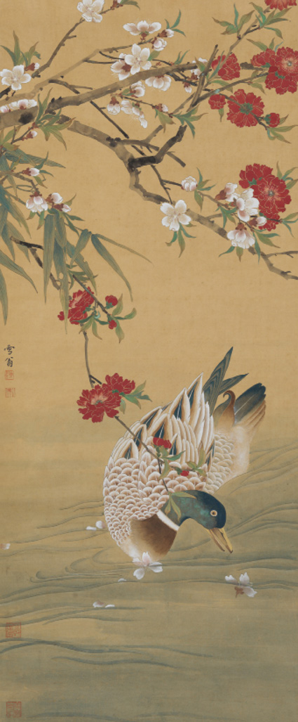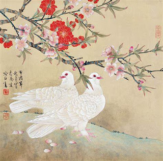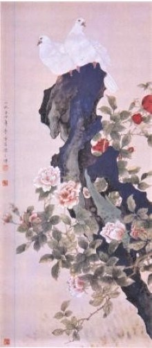 29. Trần Chi Phật, Hoa tường vi và đôi chim câu, tranh cuốn dọc, mực và màu trên giấy, 100 x 45cm. Bảo tàng Nam Kinh