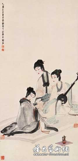 32. Phó Bão Thạch, Gảy đàn Nguyễn, tranh cuốn dọc, mực và màu trên giấy, 1945. 98.2 x 47.8cm. Nam Kinh Bảo tàng Kỉ niệm Phó Bão Thạch