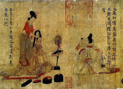 31. Cố Khải Chi, Trang điểm, chi tiết trích từ Nữ sử châm đồ, tranh cuốn ngang, mực và màu trên lụa (có thể là bản sao của thời Đường từ bức tranh có từ thế kỉ 4-5). 24.8 x 348.2cm. Bảo tàng Anh Quốc, London