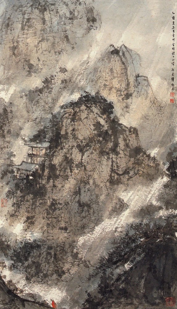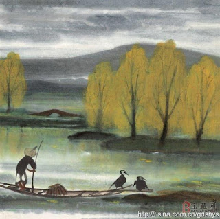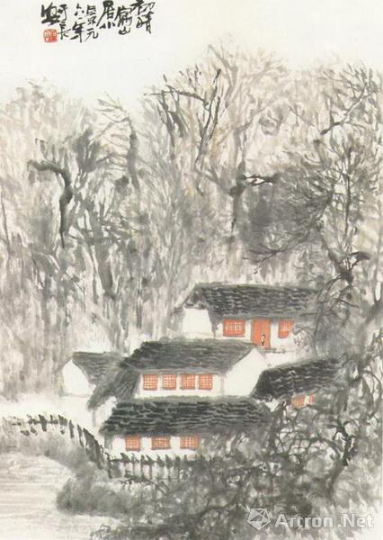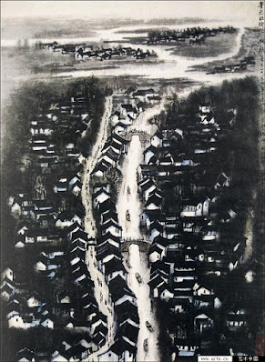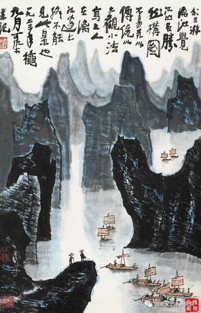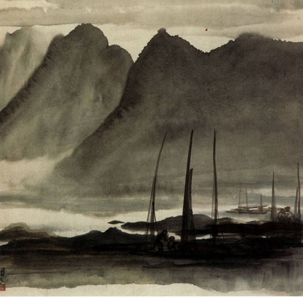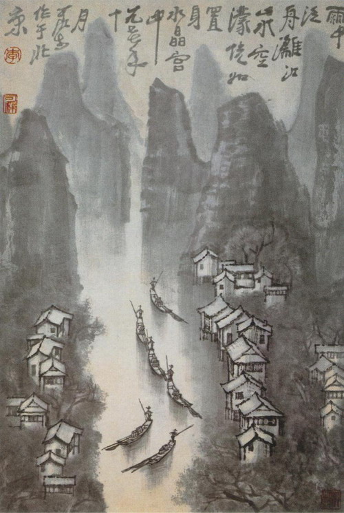 36. Lí Khả Nhiễm, Mưa bụi trên dòng Li Giang, mực trên giấy, 1977. 71 x 48cm. Sưu tập tư nhân