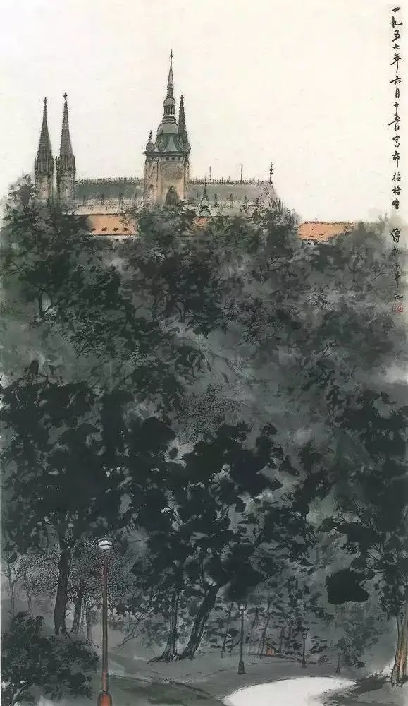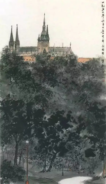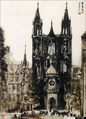 35. Lí Khả Nhiễm, Giáo đường Meissen, mực và màu trên giấy, 1957, 49 x 36cm. Sưu tập tư nhân