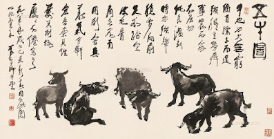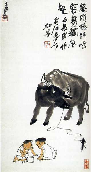Con trâu đóng vai trò quan trọng đối với Trung Quốc hàng ngàn năm, và là đề tài yêu thích trong hội hoạ truyền thống tối thiểu từ thời Đông Hán. Tuy nhiên, khi miêu tả đề tài này, Lí Khả Nhiễm đã vừa dùng bút pháp cách tân vừa cho hình tượng con trâu một ý nghĩa mới. Bức Chăn trâu hay Thu hứng (hình 34) vẽ vào những năm 1940. Miêu tả hai mục đồng đang say sưa xem đá dế; con trâu già thì bị buộc dây vào một cái cọc nhỏ. Trên tranh, Tề Bạch đã đề những dòng: “Hốt văn tất suất minh, dung dị thu phong khởi” (Chợt nghe tiếng dế gáy, dễ dàng làm nhớ gió mùa thu). Trời tiết thu, mùa cảm khái tháng ngày đã trôi qua. Bầu trời mùa thu trong tranh sáng và trong. Hai tiểu mục đồng vẽ bằng nét bút nhỏ sắc, màu thịt da phơn phớt, còn con trâu già dùng phương pháp bát mặc, duy cặp sừng của nó đi nét cong. Nét phác hoạ nhạt và giản phác vẽ hai trẻ mục đồng tương phản mạnh với con trâu già bằng lối vẩy mực đậm, còn sợi dây thừng cho thấy mối liên lạc mật thiết giữa con vật và người chăn nó. Bức hoạ của Lí Khả Nhiễm và câu thơ đề của Tề Bạch Thạch kết hợp thành một tổng thể – hài hoà của đường nét và mặt bằng, đen và trắng, và phối hợp của thơ với hoạ đã tạo thành một kết hợp nghệ thuật thật thú vị. Qua giới thiệu của Từ Bi Hồng, Lí Khả Nhiễm đã bái Tề Bạch Thạch làm thầy vào năm 1947. Tuy bức tranh Chăn trâu không đề ngày tháng, nó nhất định được vẽ sau khi Tề nhận Lí làm đệ tử. Lí quý trọng thầy mình, về phần Tề cũng yêu quý học trò và tranh của ông. Hai người có những khí chất tương tự, đều yêu sự chất phác của nông dân và đời sống điền viên. Chẳng hạn bức Liễu ngưu đồ (Liễu và trâu) của Tề có thể so sánh với Chăn trâu của Lí. Không lâu sau khi bái Tề là sư phụ, Lí Khả Nhiễm đã thỉnh giáo Hoàng Tân Hồng làm thày dạy tranh sơn thuỷ và hoạ luận. Dưới sự chỉ điểm của hai bậc thầy này, Lí đã có bước tiến bộ lớn về tinh thần và bút mặc Quốc Hoạ.