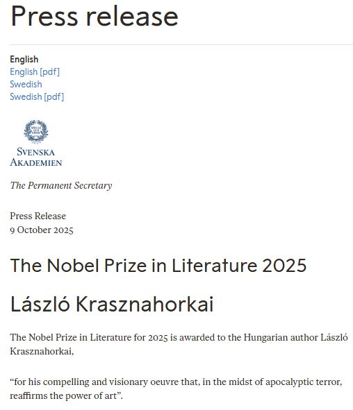 Anders Olsson, Chủ tịch Ủy ban Nobel, https://www.nobelprize.org/prizes/literature/2025/bio-bibliography/