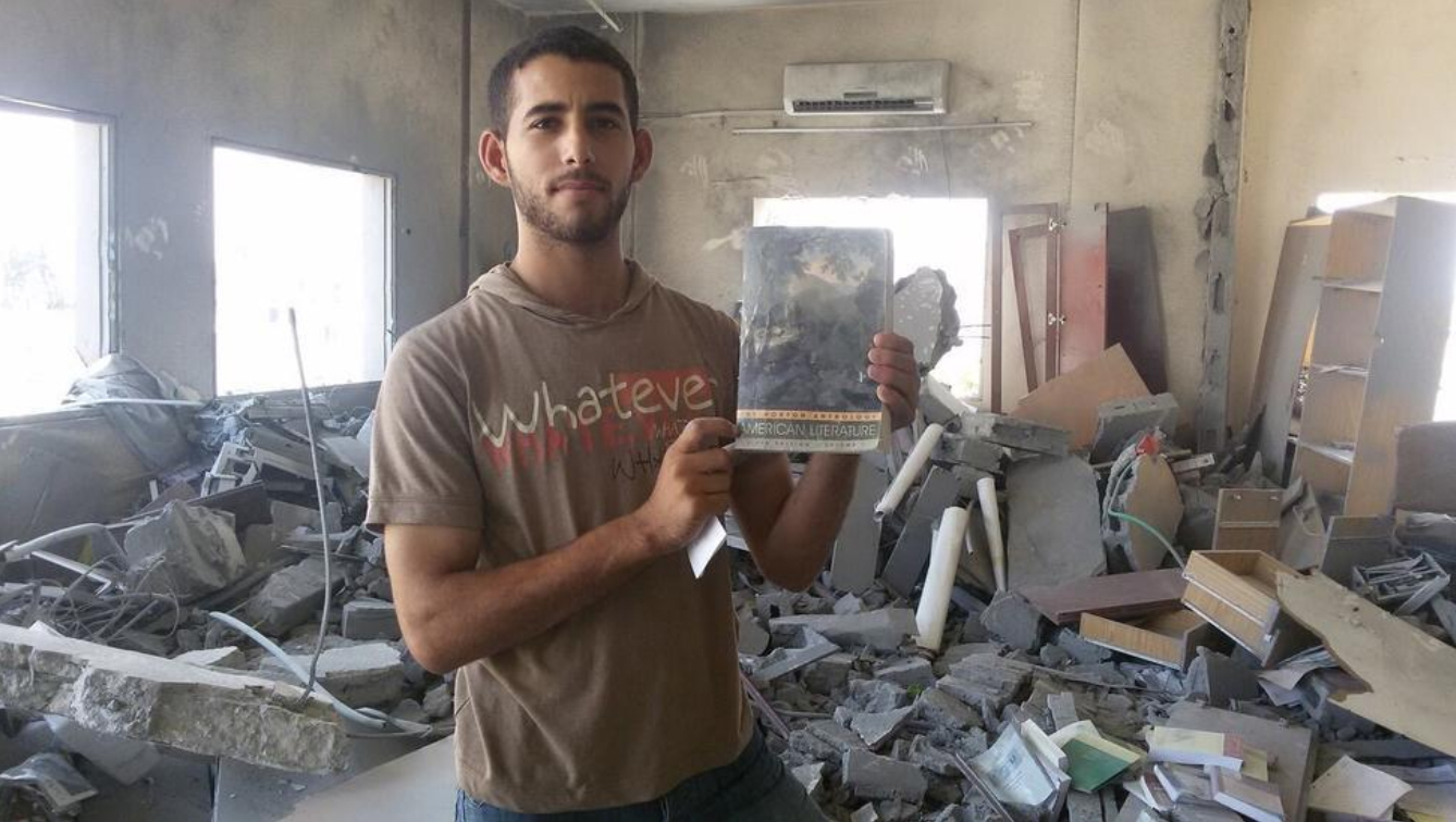 Nhà thơ Mosab Abu Toha cứu được một cuốn sách từ gạch vụn Gaza năm 2014, gợi ý cho anh làm thư viện. (Hình từ chương trình Harvard University Scholars at Risk Program)