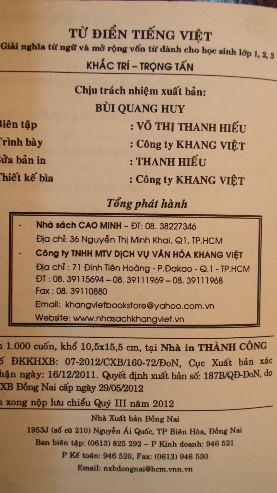 Những lỗi trên đây trong cuốn “Từ điển tiếng Việt dành cho học sinh lớp 2-3”-XB 2012 (“dành cho lớp 2-3” là theo “Lời nói đầu”, thực tế ngoài bìa ghi “dành cho lớp 1,2,3”). Ra hiệu sách SAHABA tìm hiểu chúng tôi thấy đồng tác giả Khắc Trí-Trọng Tấn NXB Đồng Nai còn có “Từ điển tiếng Việt dành cho học sinh lớp 4″ và “Từ điển tiếng Việt dành cho học sinh lớp 5“(đều XB quý II/2014). Nhận xét tổng thể của chúng tôi: