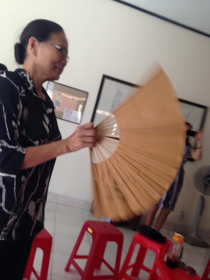 Bị cúp điện, chủ (nhà thơ Ý Nhi) và khách (nhà giáo Vũ Thế Khôi) phải dùng quạt giấy!