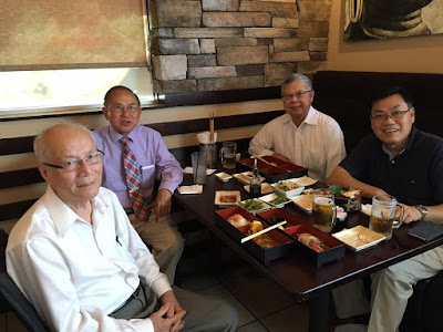 Gặp mặt hôm tháng 9/2016 tại quán Sapporo Sushi, gần bệnh viện UC Irvine. Từ trái qua phải: Giáo sư Lê Xuân Khoa (cựu phó viện trưởng Viện Đại Học Sài Gòn), Nhà văn Bác sĩ Ngô Thế Vinh, Kĩ sư Phạm Phan Long, và tôi.