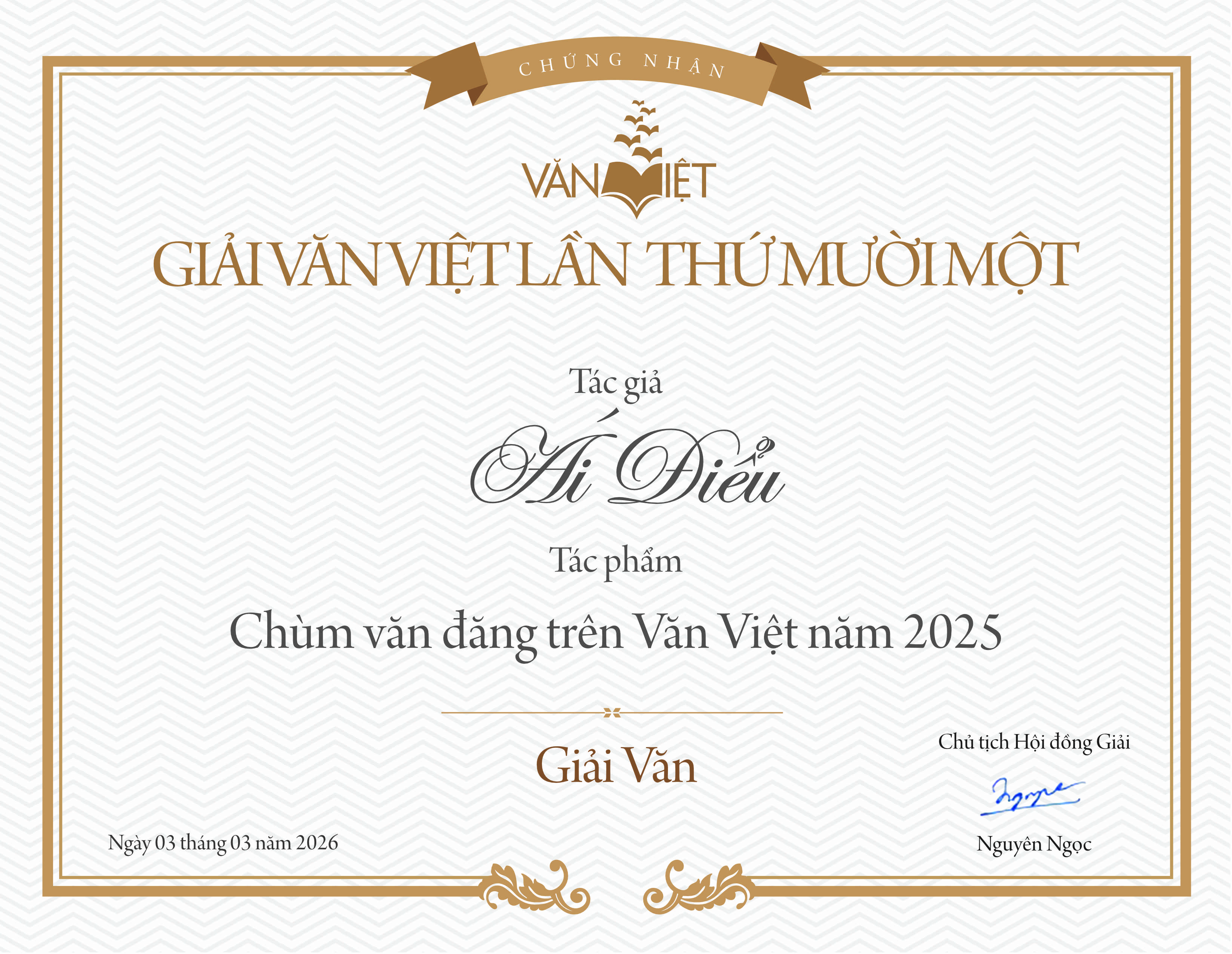 Giải Văn năm nay được trao cho chùm văn của Ái Điểu với 4/5 phiếu bầu chọn (Ban Xét Giải Văn gồm các nhà văn Ngô Thị Kim Cúc, Võ Thị Hảo, Nguyên Ngọc, Nguyễn Viện và Ngu Yên).
