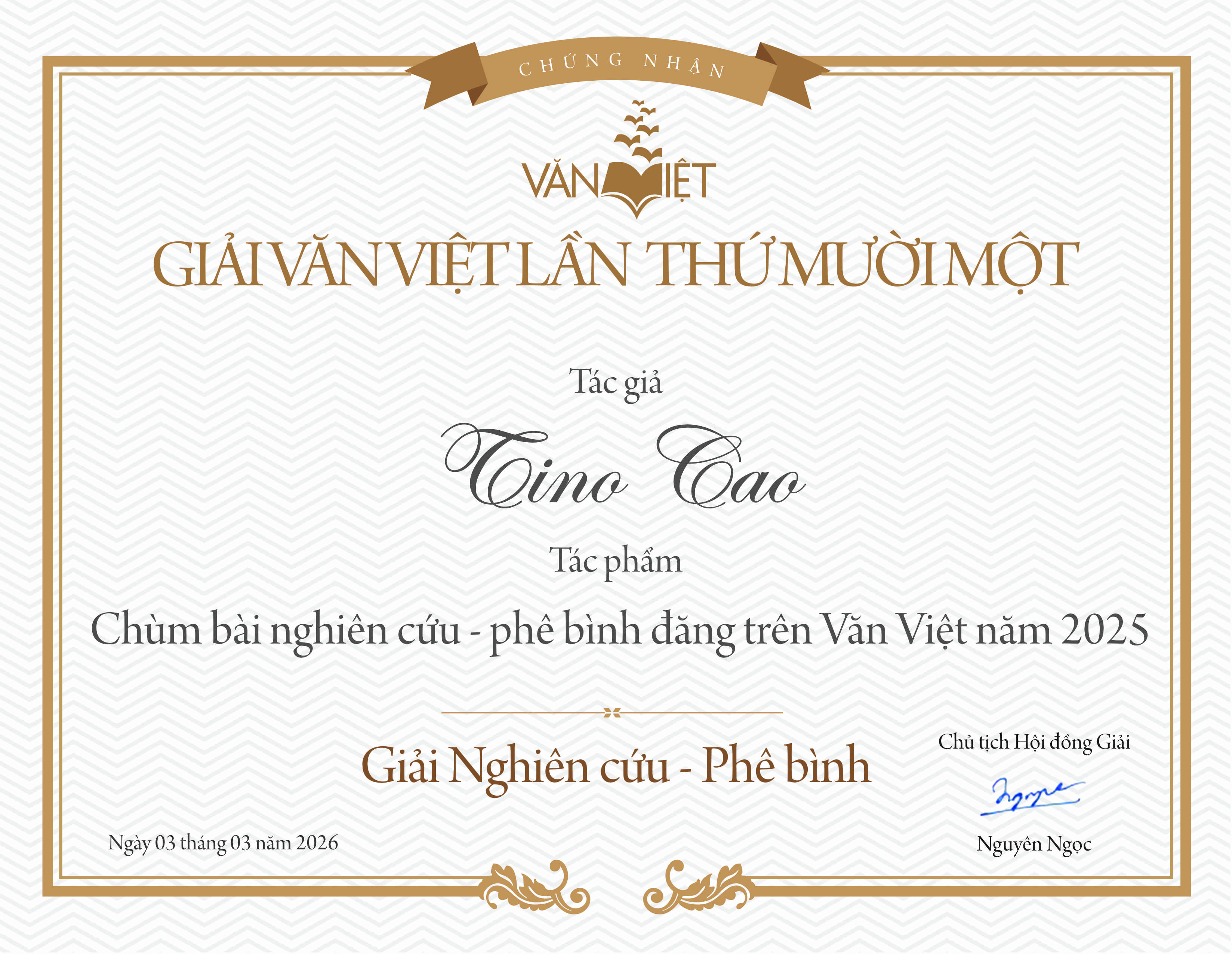 Giải Nghiên cứu – Phê bình được trao cho chùm bài của Tino Cao với 4/5 phiếu bầu chọn của các thành viên trong Ban Xét Giải Nghiên cứu – Phê bình (gồm các nhà thơ, nhà văn, nhà nghiên cứu – phê bình Hoàng Dũng, Inrasara, Nguyễn Phượng, Trịnh Y Thư và Nguyễn Thị Tịnh Thy).
