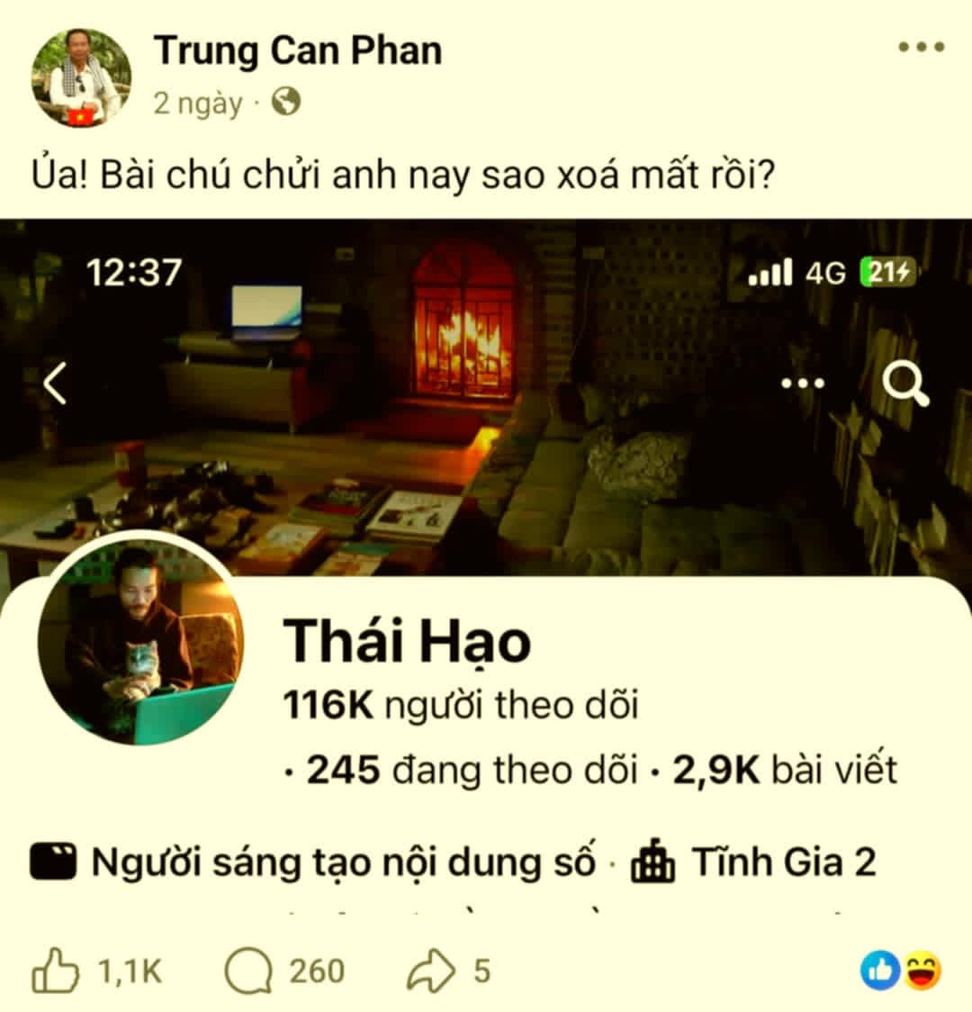 Nhân việc ông nhắc đến tôi trong một status. Tôi cũng không bao giờ có ý định chửi ông hay bất kỳ ai. Chắc ông bị ám thị trong lúc chiến đấu hăng hái quá, hoặc lúc này, giữa “men say chiến thắng”, ông nhìn ai cũng thành kẻ thù cả, nên tưởng tượng ra thế thôi. Nói cho chính xác, tôi có nhắc đến “một ông Phan Trung Can nào đó” một lần, nhưng là trong một bài viết hoàn toàn không chửi mắng gì cả. Đó là bài tôi điểm lại bốn thập kỷ dư luận xung quanh tác phẩm Nỗi buồn chiến tranh, và ở đây nhắc đến cái tên “Phan Trung Can” chỉ để minh họa rằng, dư luận lần này tuyệt đại đa số là không thuộc giới chuyên môn. Ông có thể xem lại ở đây: https://www.facebook.com/share/p/1CHQd5xEYq/
