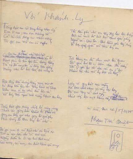 * Nguyên văn bài thơ Với Khánh Ly cùng bức ảnh do Thầy Dũng Hoàng chụp lại trang đăng trên báo Văn Nghệ số ra ngày 1.11.2025, nay đã bị tờ báo gỡ bỏ. Ảnh chụp bản viết tay bài thơ, mang thủ bút của nhà thơ Phạm Tiến Duật [có ghi rõ ngày và nơi viết bài thơ: “Sài Gòn, 21-5-1975” nhưng khi đăng báo Văn Nghệ cắt chi tiết quan trọng này – Văn Việt], hiện lưu hành trên trang Facebook cá nhân của nhà văn Nguyễn Đình Bổn.
