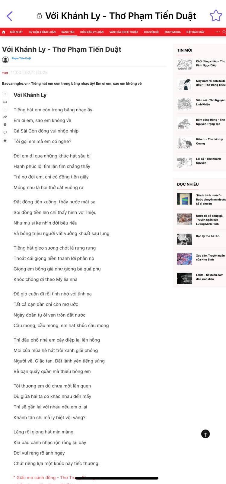 * Nguyên văn bài thơ Với Khánh Ly cùng bức ảnh do Thầy Dũng Hoàng chụp lại trang đăng trên báo Văn Nghệ số ra ngày 1.11.2025, nay đã bị tờ báo gỡ bỏ. Ảnh chụp bản viết tay bài thơ, mang thủ bút của nhà thơ Phạm Tiến Duật [có ghi rõ ngày và nơi viết bài thơ: “Sài Gòn, 21-5-1975” nhưng khi đăng báo Văn Nghệ cắt chi tiết quan trọng này – Văn Việt], hiện lưu hành trên trang Facebook cá nhân của nhà văn Nguyễn Đình Bổn.