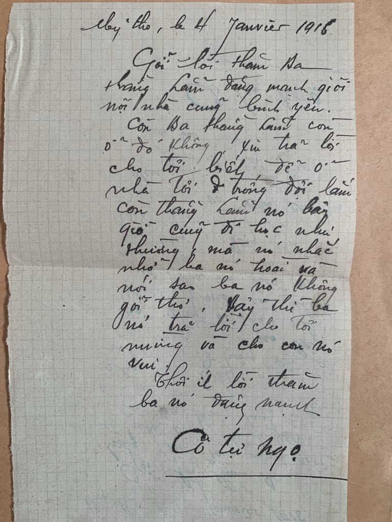 Thư viết bằng chữ Quốc ngữ đầu thế kỷ 20, có một số từ dùng theo phương ngữ Nam Bộ và cách viết thời bấy giờ, toàn văn như sau: