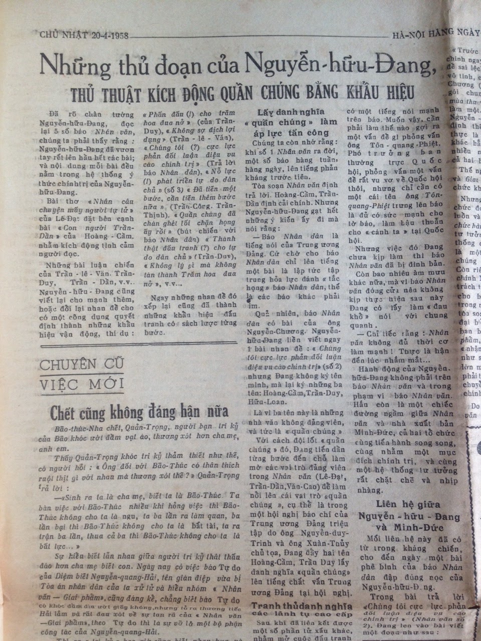 Ngay trước đó, năm 1957, chủ nhiệm của tờ báo là Nguyễn Đức Mưu. Ở đoạn này, có bài báo của Phan Cự Đệ mà ta sẽ nói rõ hơn dưới đây: