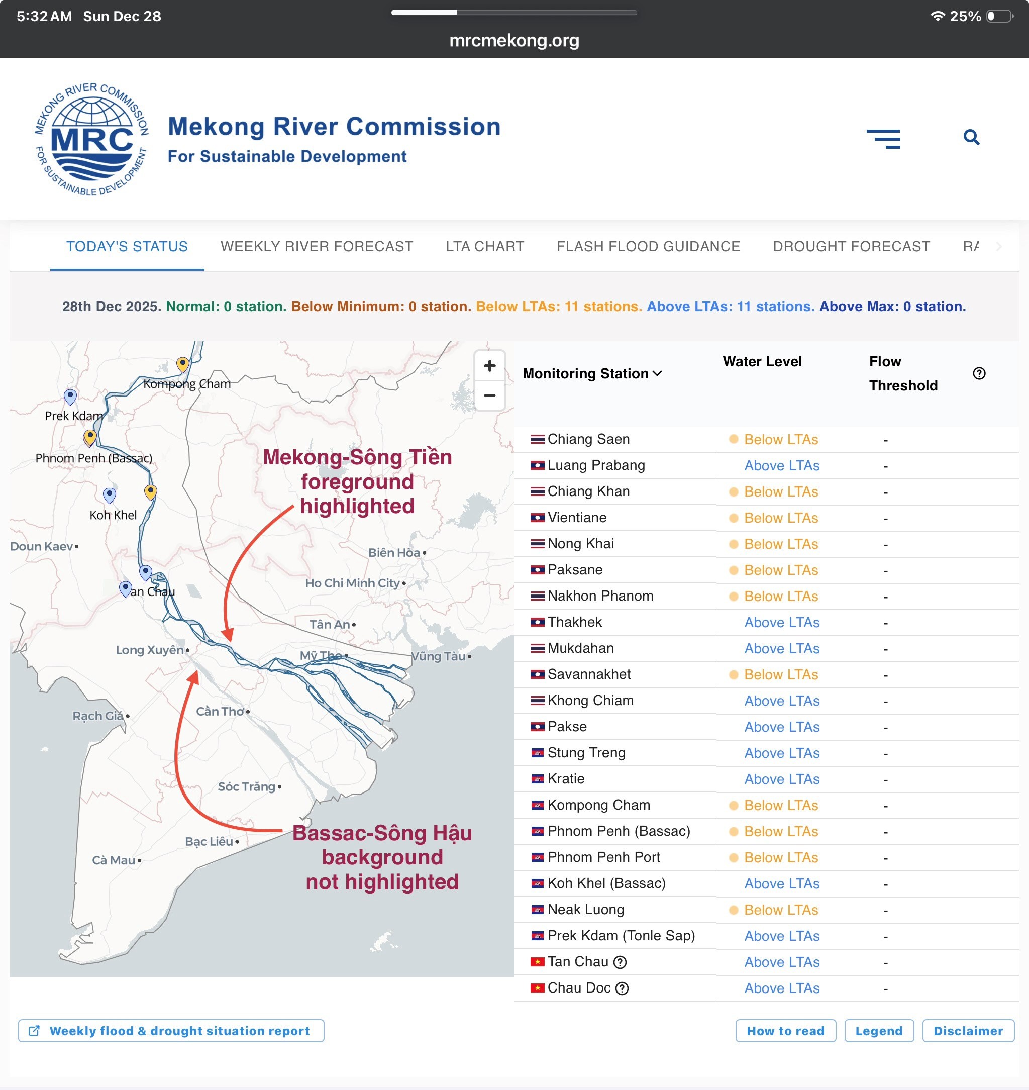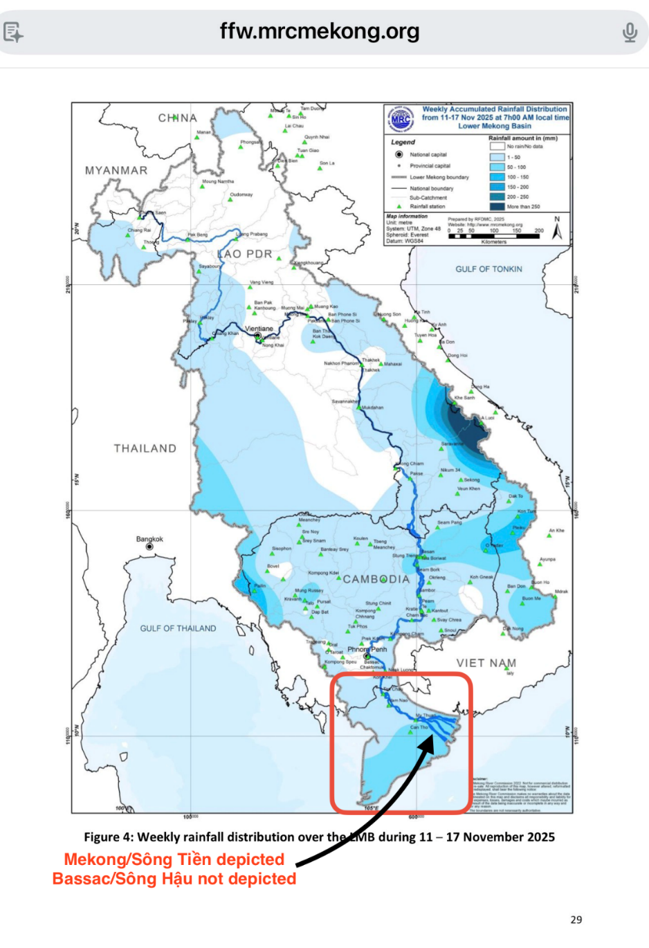 Trong khi các báo cáo của MRC tham khảo một cách đáng tin cậy các trạm Bassac trong văn bản và bảng (ví dụ: Phnom Penh (Bassac), Koh Khel, Chau Doc), mô tả trực quan cho hệ thống sông khác nhau ngay cả trong cùng một tài liệu. Một ví dụ rõ ràng là Báo cáo tình hình mùa khô hàng tuần từ ngày 11–17 tháng 11 năm 2025 (Xem tệp đính kèm)