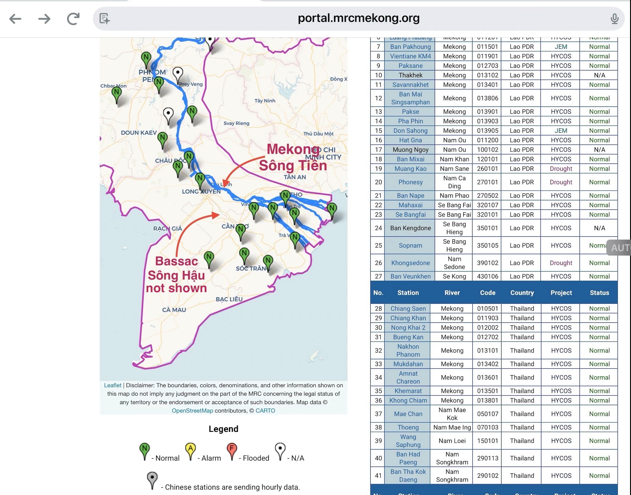 Hình 1: Trang mạng hiện tại của MRC cho thấy sông Mekong – Sông Tiền và năm nhánh nhỏ của nó được vẽ bằng màu xanh đậm ở phía trước, trong khi sông Bassac-Sông Hậu, một nhánh chính của sông Mekong có màu xám nhạt ở hậu cảnh khiến các trạm quan trắc sông Kok Khel và sông Tân Châu xem như bị mắc cạn trên đất liền.