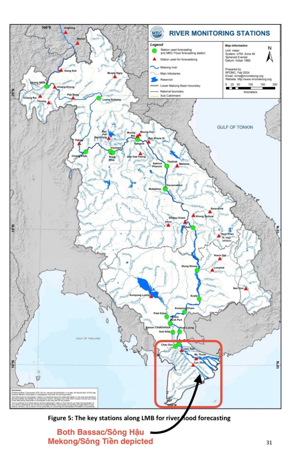Ngược lại, Hình 5 (Các trạm chính dọc theo LMB để dự báo lũ lụt sông) mô tả đầy đủ và tỷ lệ hơn Bassac: một sự phân chia rõ ràng gần Phnom Penh, các đường riêng biệt có thể so sánh với tầm nhìn của sông Tiền, và các trạm quan trắc được kết nối dọc theo các kênh liên tục. Không có trạm nào bị cô lập và Bassac được đối xử bình đẳng.