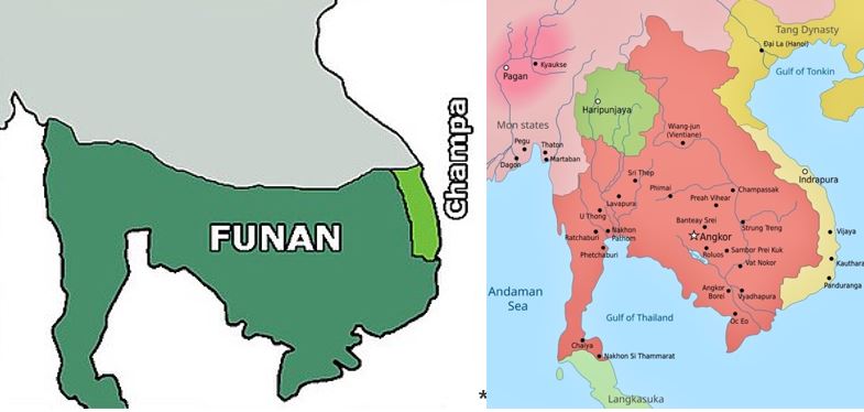 Hình 2: trái, sơ đồ Vương quốc Phù Nam – nơi còn ghi nhận di tích con kênh Phù Nam, bao gồm các vùng đất phía nam Việt Nam, Cam Bốt sang tới Thái Lan và bán đảo Mã Lai. Phù Nam chỉ tồn tại tới thế kỷ thứ VII sau đó bị Chân Lạp [Chenla] thôn tính; kế tục Chân Lạp là Đế Quốc Khmer hùng mạnh, phải, với diện tích bao trùm nam Việt Nam, Cam Bốt, Lào, Thái Lan và bán đảo Mã Lai, ra đời từ thế kỷ thứ IX và rồi tiêu vong vào thế kỷ thứ XV, nhưng còn lưu lại một quần thể kiến trúc Angkor [Đế Thiên Đế Thích] như một kỳ quan của thế giới – và còn rải rác những phế tích khác như ngôi đền Hindu Preah Vihear. Tiếp sau Đế chế Khmer Angkor, chỉ còn lại một Vương quốc Cam Bốt nhỏ bé với lịch sử thăng trầm cho tới ngày nay. (nguồn: Wikipedia)