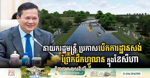 Hình 4: Thủ tướng Hun Manet con trai Hun Sen, hứa hẹn sẽ cấp đất cho người dân phải di dời. Hình bên là minh họa Kênh đào Funan Techo của Cam Bốt khi hoàn tất – và cũng để thỏa Giấc mộng phục hưng Đế Chế Phù Nam của gia tộc họ Hun. [Nguồn: Peng Huoth].