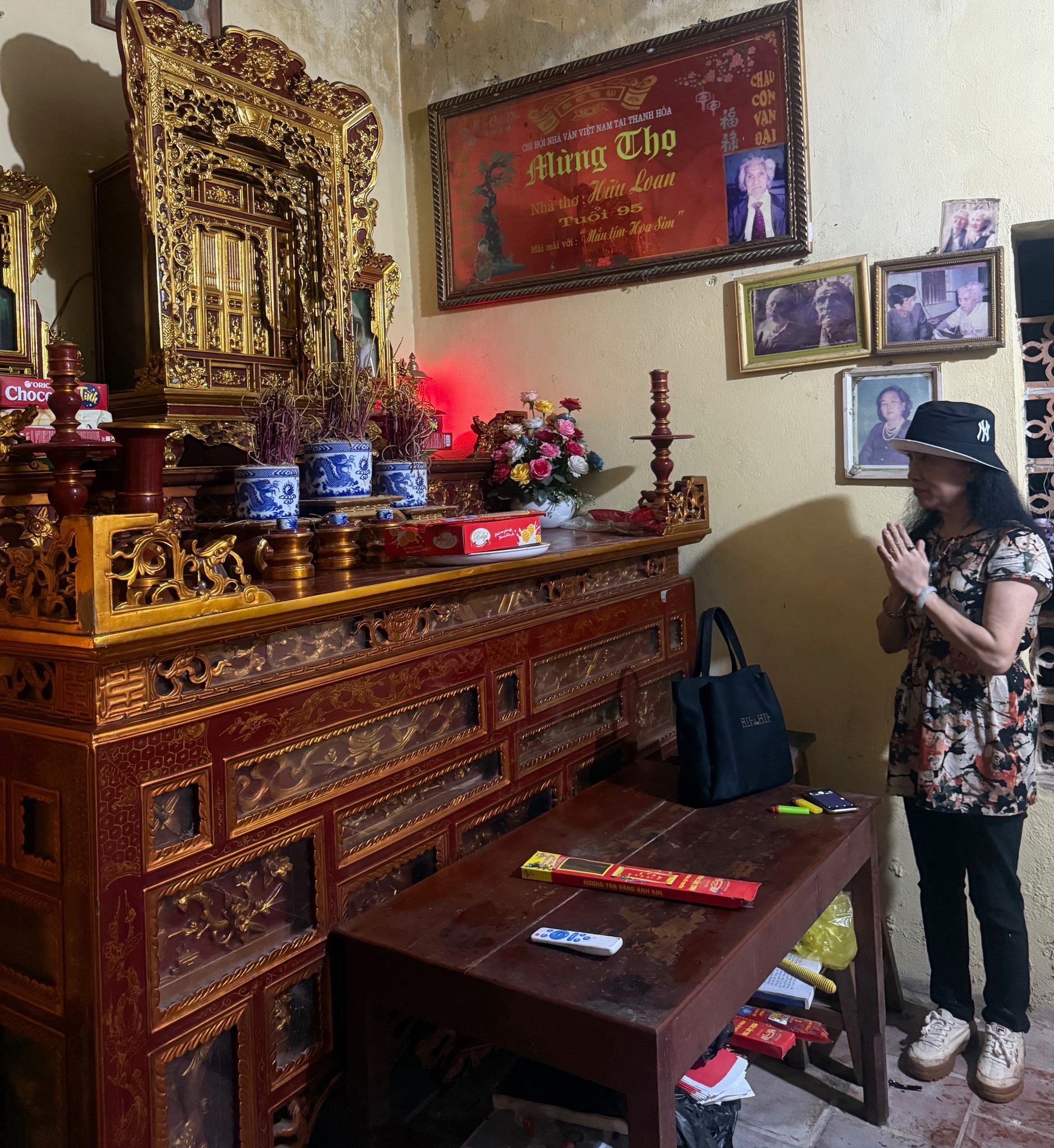 Tháng 10.2025. Niệm hương trước bàn thờ nhà thơ Hữu Loan. Trên tường là bức trướng Chi hội Nhà văn Việt Nam tại Thanh Hóa mừng thọ nhà thơ Hữu Loan tuổi 95.