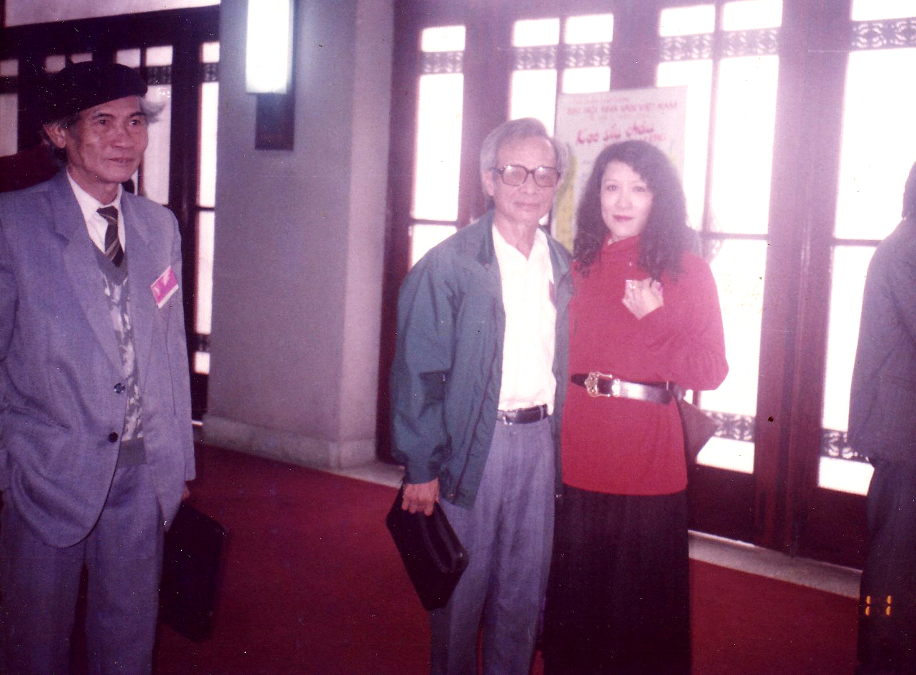 Tháng 1.1995. Bên ngoài hành lang Đại hội V Hội Nhà văn Việt Nam. Nhà văn Vũ Bão, nhà thơ Xuân Sách, Ngô Thị Kim Cúc.