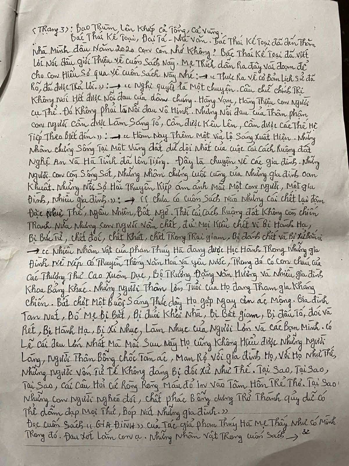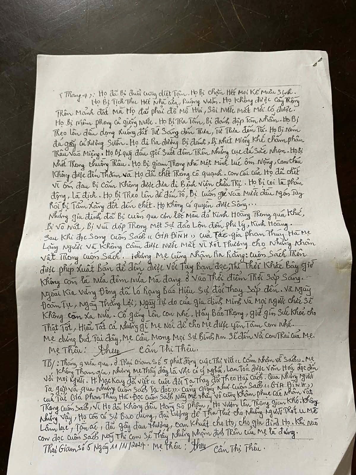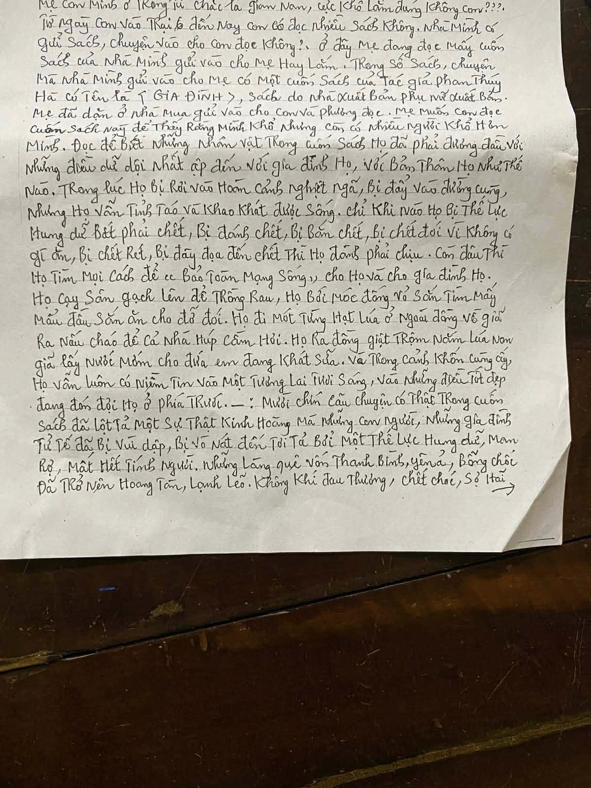 Từ ngày con vào trại 6 đến nay con có đọc nhiều sách không. Nhà mình có gửi sách, chuyển vào cho con đọc không, ở đây mẹ đang đọc mấy cuốn sách nhà mình gửi vào cho mẹ. Hay lắm. Trong số sách, chuyện gửi vào cho mẹ có một cuốn sách của tác giả Phan Thuý Hà có tên là GIA ĐÌNH, sách do nhà xuất bản Phụ Nữ xuất bản. Mẹ đã dặn ở nhà mua gửi vào cho con và Phương đọc. Mẹ muốn con đọc cuốn sách này để thấy rằng mình khổ nhưng còn nhiều người khổ hơn mình.